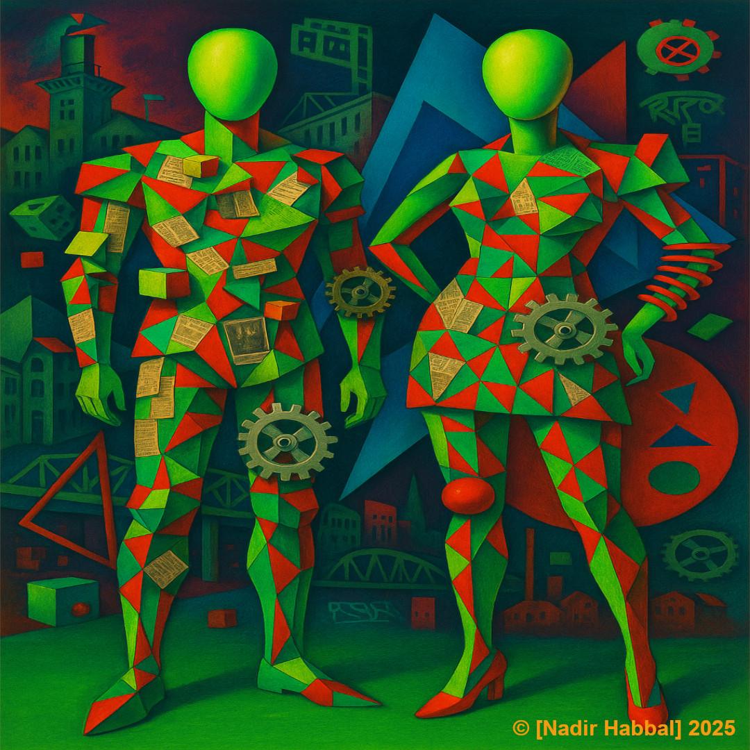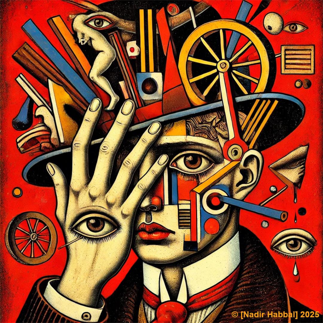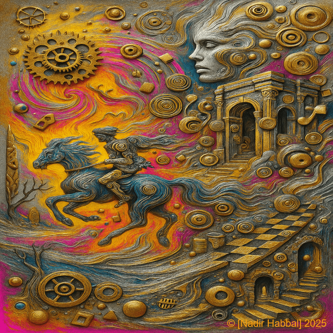 Zahnräder, Neonfarben, surreale Formen und historische Fragmente tanzen miteinander.