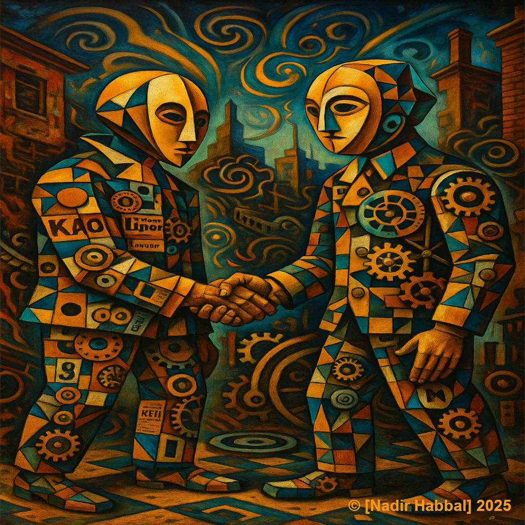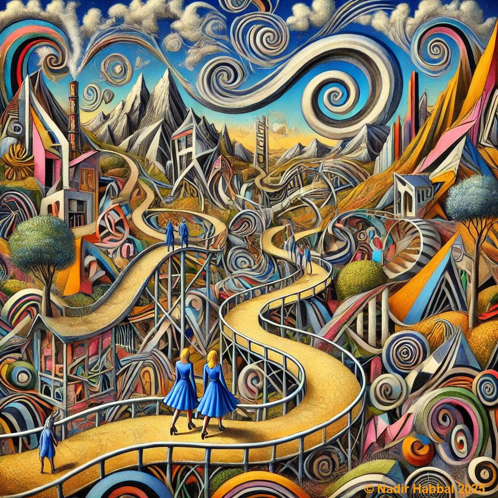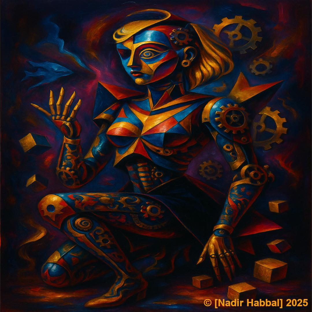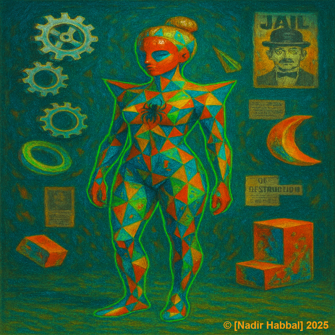 Zahnräder, Neonfarben, surreale Formen und historische Fragmente tanzen miteinander.