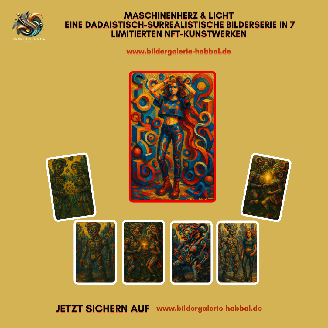 Sichere dir limitierte NFT-Unikate aus der Reihe „Maschinenherz & Licht“, die dadaistische und surreale Welten in leuchtende Farbexplosionen verwandeln.