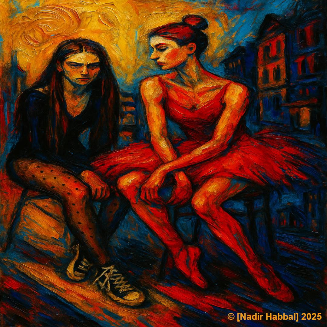 Zwei Frauen teilen sich eine Bühne: Bewegung und Stillstand, Licht und Schatten. Ein intensives Bild über innere Spannung und stille Verbundenheit.